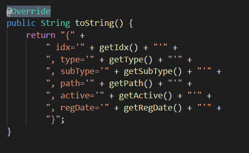 toString()메서드를 오버라이딩하여 원하는 문자열을 반환하도록 정의하는 경우입니다. - 오버라이드를 하지 않으면, 상위 클래스의 기본 구현이 그대로 사용됩니다.